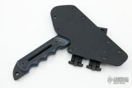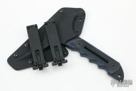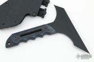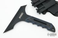 This Tomahawk by Point Break Cutlery features a black chisel ground black with sharpened edges all around, black/blue G-10 scales, .250" blade stock, full tang construction. Comes with a kydex sheath.Excellent condition.