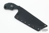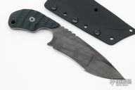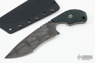 This Rare SLCC by Mick Strider features a tiger stripped recurve nightmare ground blade with sharpened top edge and notched thumbrest, .190" blade stock and 1.497" blade depth, full tang construction. The handle has black/green G-10 scales. Comes with a kydex sheath. Excellent condition. Dated '06