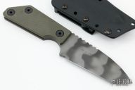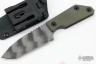 This RW-2 by Strider Sknives features G-10 green scales. Tiger stripe blade with fuller on blade spine, .252" blade thickness and 1.603" blade depth. Notches on thumbrest and rear of handle. Comes with a kydex sheath with TekLok.