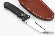This L&L (Loveless & Lum) Special by David Sharp is based on a combination of Loveless New York Special and a Lum Field Grade Tanto. It features a tanto mirror polished blade with satin convex tanto tip, .163" blade stock and .920" blade depth, full tapered tang construction. The handle has black rag micarta scales made from micarta from Bob Loveless's shop, red liners, stainless steel pins and a lanyard hole. Comes with a brown leather sheath with snap. Excellent condition.