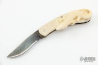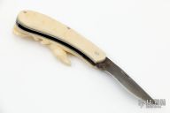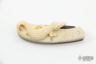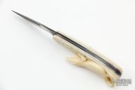 This slipjoint folder by Hidetoshi Nakayama features a hand rub satin finished blade with nail nick. The handle has carved mammoth ivory scales with a beautifully carved alligator, nickel silver liners and a fileworked steel spring. Has half-stop, flush in all positions. Has a crack in the front scale at the middle pin, otherwise excellent condition.