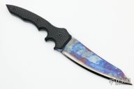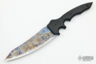 This fixed blade by Aaron Harris features an anodized titanium chisel ground blade with a notched thumbrest, .204" blade stock and 2.005" blade depth, full tang construction. The handle has textured black paper micarta scales. Excellent condition. Comes with a zippered case.