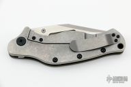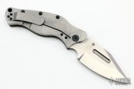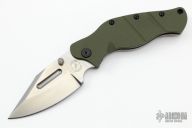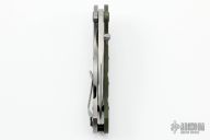 This knife has a satin finished blade with fullers and single thumbstud. The handle has green G-10 scales, tumbled titanium frame and tip up clip. Has stainless lockface insert with integral over travel stop. Comes with original packaging. New from maker.