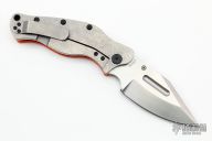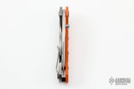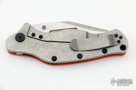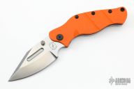 This knife has a satin finished blade with fullers and single thumbstud. The handle has orange G-10 scales, tumbled titanium frame and tip up clip. Has stainless lockface insert with integral over travel stop. Comes with original packaging. New from maker.