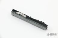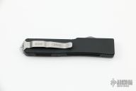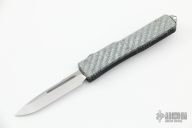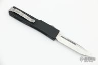 This UTX-70 OTF automatic by Microtech features a satin finished  drop point blade with a standard edge. The handle has a silver twill top and a black aluminum bottom with a stainless steel tip down clip. Comes with original sheath. Dated 05/2005. Excellent condition.