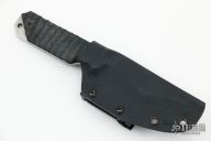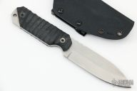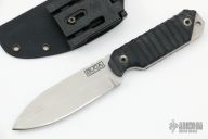 This knife by BUDA features a matte finished blade with notched thumbrest, .200" blade stock and 1.399" blade depth, full tang construction with black G-10 scales. Comes with a kydex sheath. Excellent condition.