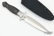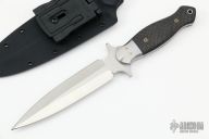 This Dagger by David Mosier features a satin finished double edged blade with .182" blade stock and 1.266" blade depth, full tang construction. The handle has stainless steel bolsters with mosaic pins, carbon fiber scales with mosaic pins. Comes with a kydex sheath with TekLok. Excellent condition.