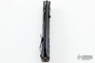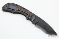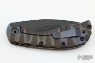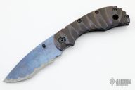 This RC framelock by Mick Strider and Warren Thomas features a chisel ground recurve carbon fiber and titanium blade with notched thumbrest and dual thumbstuds. The handle has a sculpted titanium frame, titanium backspacer and tip up titanium clip. Nice detent, lockup and blade seating. Has a couple light scratches on the: frame, clip, and backspacer, otherwise excellent condition.