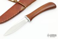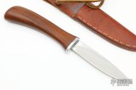 This Hunter by Ted Dowell features a mirror polished blade .136" blade stock and .798" blade depth, hidden tang construction. The handle has an aluminum guard with a wood grip. Comes with a brown leather sheath. The knife shows signs of being resharpened otherwise it is in excellent condition.