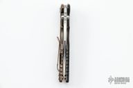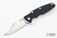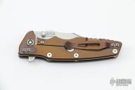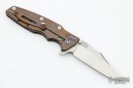 This Eklipse by Hinderer Knives features a stonewashed bowie blade with dual thumbstuds, flipper and notched thumbrest. The handle has a tumbled and anodize finish titanium frame and liner with a textured black G-10 scale, titanium clip and hardware. Nice detent, lockup and blade seating. Tri-way pivot system.  Excellent Condition. Comes with Complete Battle Bronze Titanium Hardware kit.
