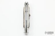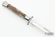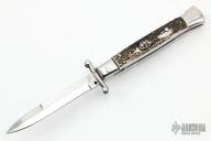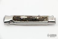 This Swing Guard Lockback Auto by AKC Italy has a polished stainless steel spear point blade with false top edge. Handle has stag scales with stainless steel bolsters, steel liners, and stainless steel back spacer and lock. Skull push button.  Has safety. Has a few light scratches, otherwise excellent condition.