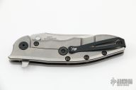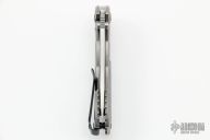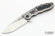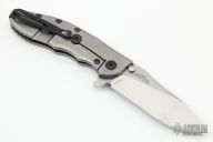 This Hinderer Designed 0562 Framelock Flipper has a drop/ spear point blade with swedge, notched thumb rest, dual thumb studs and flipper. Handle has a stonewashed titanium frame with stainless steel lockbar insert and lockbar stabilizer. Stainless steel clip is tip up. Non-slip tape is attached to the frame of the knife. Includes a Zero Tolerance box and papers.  Excellent Condition.