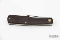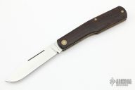This Bent Gunstock by Thys Meades features a hand rub satin finished blade with nail nick. The handle has wood covers over brass liners and a steel backspacer. Comes with the original box.  Half-stop is flush in all position.  Excellent Condition.