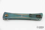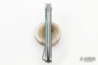 This midtech Bones flipper by Jeff Park features a satin finished blade with notched thumbrest and flipper. The handle has a milled/anodized titanium frame with bead blasted and anodized tip-up titanium clip and anodized titanium backspacer with lanyard hole. Nice crisp detent, solid lockup. Blade favors right side and rubs the frame. Excellent condition.