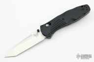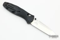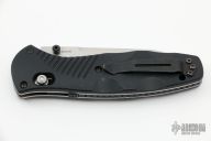 This knife by Benchmade features a stonewashed drop point blade with dual thumb studs and notched thumb rest. The handle has black plastic scales, stainless steel sub frame and barrel spacers. The black coated, deep carry stainless steel tip up clip is reversible for right or left hand carry. Excellent condition.