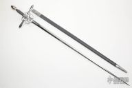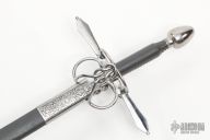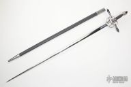We found this rare rapier in an old catalog of antique weapons, which had described it as German, and felt we should reproduce it. The hilt shows design aspects of some larger swords, but the knot shaped basket is very unusual and we hadn’t seen its like before. The sword is light and quick and balances in the hand nicely. The parts are steel and the grip is textured leather over wood. The blade is high carbon steel and tempered to a good spring. The scabbard has a highly decorative throat and tip. Made by Windlass Steelcrafts®.