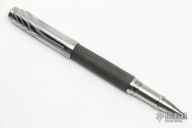 Solid Titanium with Uni Carbon Fiber body overlay, with Ripple Damasteel Stainless Steel Damascus cap overlay. Roller Ball Pen. New from maker. Takes a Schmidt refill.
