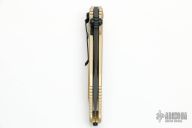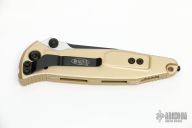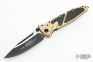 This Socom Elite from Microtech has a black/satin blade with dual thumbstuds and notched thumbrest. The handle has a Champagne Gold aluminum frame with carbon fiber inserts and a tip down stainless steel clip. Dated 08/2019 and S/N 5881. Includes original box and paperwork. Excellent condition.