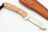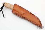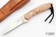 This fixed blade by Bakr-Bilt features a hand rubbed satin finish blade with .160" blade thickness and .933" blade depth, full tapered tang construction. The handle has maple burl wood scales with red liners. Comes with a brown leather sheath. Excellent condition. #1147