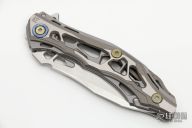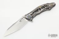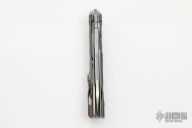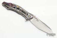 This DCPT Tanto by Custom Knife Factory features a two-tone blade with notched thumbrest and flipper. The handle has tri-tone titanium scales, blasted titanium liners and backspacer, black timascus pivot collars and tip up clip with hidden screws, also comes with a plain titanium clip. Nice detent, lockup and blade seating. Rides on bearings. Comes with velcro case, extra hardware and COA. S/N 7. Excellent condition.