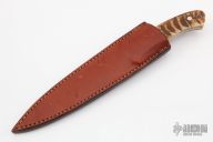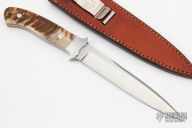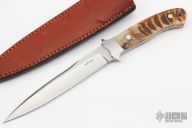 This Fighter from Mr. Pease features a hand rub satin finished blade with a false top edge, .175" blade stock and .967" blade depth, full tapered tang construction. The handle has stainless steel bolsters, sheep horn scales with stainless steel pins. Comes with a brown leather sheath with boot clip. Excellent condition. "Em6" on blade.