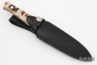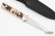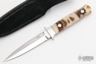 This Tri-Grind Dagger by John Young is 1 of 10 made. It features a mirror finished double-edged blade with a hollow ground backside, .194" blade stock and .809" blade depth, full tapered tang construction. The handle has mirror polished stainless steel guard, sheep horn scales with red liners. Comes with a black leather sheath. Excellent condition.