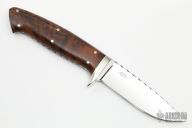This Hunter from the Late Joe Kious features a mirror finished blade with a fileworked spine and all around the tang, .185” blade stock and 1.037” blade depth, full tapered tang construction. The handle is comprised of a nickel silver guard, walnut scales with black liners. Comes with a brown leather sheath. Excellent condition.
