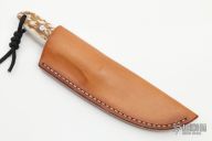 This fixed blade by Bakr-Bilt features a hand rubbed satin finish blade with .144" blade thickness and .944" blade depth, full tapered tang construction. The handle black canvas micarta bolsters, stag scales with black liners. Comes with a brown leather sheath. Excellent condition. #1460