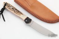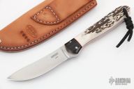 This fixed blade by Bakr-Bilt features a hand rubbed satin finish blade with .144" blade thickness and .944" blade depth, full tapered tang construction. The handle black canvas micarta bolsters, stag scales with red liners. Comes with a brown leather sheath. Excellent condition. #1458