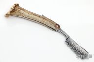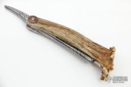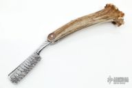 This Straight Razor by Steve Schwarzer and Will Stelter features a Damascus blade.  The handle features an integral carved stag handle with hammered copper pivot collars.  Includes a padded zippered case.  Excellent Condition.