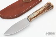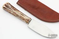 This skinner by Ted Dowell features a satin finished blade with .178" blade stock and 1.673" blade depth, hidden tang construction. The handle has a stag grip. Comes with a brown leather sheath, but the blade has poked through the end, has a few light scratches, otherwise good condition.