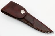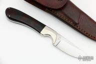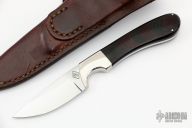 This knife by "JR" (please let us know if you know who this is) features a mirror polished blade with .125" blade stock and .925" blade depth, full tang construction. The handle has dovetailed nickel silver bolsters, black/maroon linen micarta scales. Comes with a brown leather sheath. Excellent condition. #583. Comes with a zippered case.