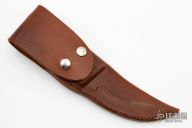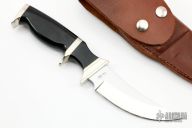 This knife by "JR" (please let us know if you know who this is) features a mirror polished blade with .204" blade stock and 1.328" blade depth, hidden tang construction. The handle has a nickel silver guard, sub-hilt and butt with white spacers and black linen micarta grip. Comes with a brown leather sheath. Excellent condition. #12-82. Comes with a zippered case.