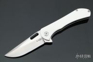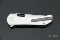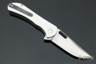 This Sectum by Michael Shiffer features a hand rub satin finished blade with a fileworked thumbrest, flipper and long thumbhole. The handle has white G-10 scales, anodized and tumbled titanium liners, Zirconium tip up clip and a fileworked and anodized titanium backspacer. Rides on bearings, nice detent, lockup and blade seating. Comes with a COA. New from maker.