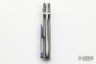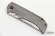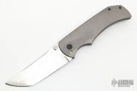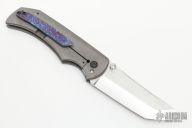 This Unnamed Model by Pohan Leu is one of the first 12, this is designated by the double squiggles under his makers mark. It features a satin finished hollow ground blade with flat ground tip, dual thumbstuds. The handle has a tumble finished and titanium frame and timascus tip up clip, Purple Haze Fat Carbon backspacer. Nice detent, lockup and blade seating. Comes with zippered case. New from maker.