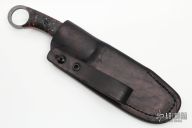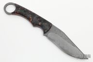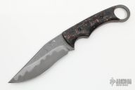 This F.H. Bowie by Jim Burke features a clip point Nichols XHP Core Damascus blade with: swedge, .2" blade stock and 1.496" blade depth, and full tang construction. Copper shred carbon fiber scales. Comes with leather sheath and COA. New from Maker.