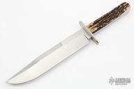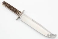 This Bowie by Jerry Langbein features a hand rub satin finished blade with a false top edge, .173" blade stock and 1.513" blade depth, full tang construction. The handle has a nickle silver guard and stag scales. Has some light scratches, otherwise excellent condition.