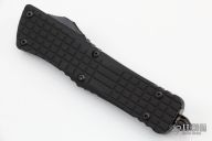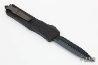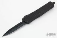 This Combat Troodon OTF automatic by Microtech knives features a double edged, DLC finished reverse full serrated blade. The handle has a DLC frag pattern aluminum handle with black hardware, tip down carry. Glass breaker. Comes with original box and papers, patch and keychain. Excellent condition.