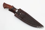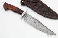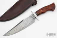 This Fighter by Milan Mozolic features a 360 layer ladder pattern Damascus (01 and 15N20) blade with false top edge, .228" blade stock and 1.633" blade depth, hidden tang construction. The handle has a stainless steel guard with stainless steel and fluted black G-10 spacers, beautiful Arizona Ironwood burl grip. Comes with an equally impressive hand tooled brown leather sheath. Comes with COA. New from maker! Comes with a zippered case.