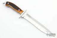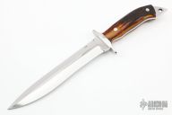 This Fighter by Mick Langley features a mirror polished blade with a false top edge, .180" blade stock and 1.325" blade depth, full tang construction. The handle has a stainless steel guard, stag scales and red liners. Excellent condition.