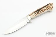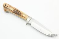 This Hunter by Red Watson features a mirror polished blade with .155" blade stock and 1.038" blade depth, full tang construction. The handle has a nickel silver guard and stag scales with black liners. Comes with a zippered case. Has a few light scratches and a light/small oxidation spot on one side of the blade, otherwise good condition. #153