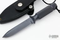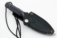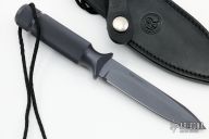 "Designed to incorporate the two basic criteria required in knives destined for hard field usage, these spear-points have plenty of blade weight and good strong points. This design has been used by soldiers all over the world who have found them to be extremely good weapons as well as rugged dependable tools. The 4” bladed Shadow III is a good everyday carry knife. " Knife and sheath are in excellent condition. The blade has a false top edge, .181" blade stock and .865" blade depth, integral construction with hollow handle. Comes with original black leather sheath by Gfeller Casemakers. Excellent condition.
