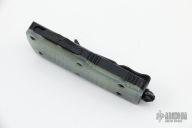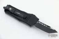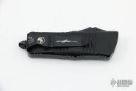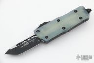 This Troodon Mini OTF automatic by Microtech knives features a black finished tanto blade with satin finished flats. The handle has a jade green G-10 top, black aluminum frame with black hardware, tip down carry. Glass breaker. S/N 081. Dated LVCKS 2022. Comes with original box and papers. Excellent condition.