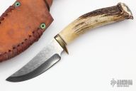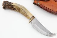 This skinner by Ken Richardson features an upswept blade with jeweled flats and satin grinds, .092" blade stock and 1.406" blade depth, hidden tang construction. The handle has a brass guard and crown stag grip, red/white spacers. Has scrimshaw on the butt. Comes with a brown leather sheath. Has some light scratches and patina, has a crack in the handle, otherwise good condition.