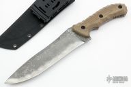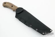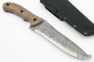 This Basara by Kiku Matsuda features an acid etched blade with false top edge and notched thumbrest, .233" blade stock and 2.017" blade  depth, full  tang construction. The handle has brown canvas micarta scales. Comes with a Kydex sheath. Excellent condition.