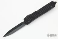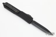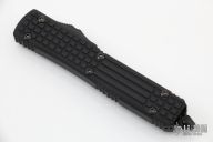 This Ultratech OTF automatic by Microtech features a D/E black DLC fluted blade. Black aluminum frag pattern frame with black tip down stainless steel clip. Dated 10/2021 and s/n 198. Excellent condition. Includes original box and papers.