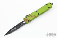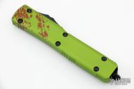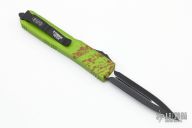 This Ultratech ZombieTech OTF Auto has a black double edged blade with fullers. Handle is toxic green anodized aluminum with custom random blood spatter pattern, and a black stainless steel tip up clip with integral glass breaker. Excellent condition. Comes with original box and papers.