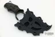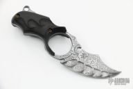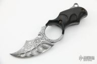 This One of a Kind Mini Bardische Neck Knife by Translyvania Custom Knives features a Vinland Damasteel blade with carved bevels, .159" blade stock and 1.055" blade depth, full tang construction. The handle has carbon fiber scales with titanium screws. The handles can be removed for a slimmer carry option. Comes with a kydex sheath with stingray skin inlays. Comes with zippered case, dog tag, stickers and COA dated June 27, 2022. New from maker.