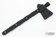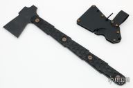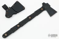 This TLAX by Turner CNC is an Ed Calderon of Ed's Manifesto original design. It is a full tang design based off of traditional native American's tomahawks, but made in a robust modern style. The TLAX is made from waterjet cut blanks of 80CRV2 plate steel that is CNC machined. The heat treat is professionally done by Peters Heat Treat with cryogenic treatment, and a hot black oxide is applied to hold oil and resist rust. The handle scales are milled from black G-10 with a no-slip texture for the toughest situations. The scales are attached with custom 17-4 stainless steel hardware made in-house and designed to be unscrewed with a penny. Has three small storage compartments inside the handle. The kydex sheath with spacers holds the blade in place with shock cord, has belt loop. Has some light scuffs and scratches, has a small ding in the blade edge, otherwise excellent condition.