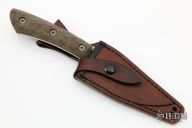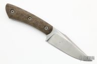 This SR-71 Silverbird by E. Scott McGhee of Guinea Hog Forge features a clip point blade with false top edge, .182" blade stock and 1.385" blade depth, full tang construction. The handle has contoured green linen micarta scales. Includes a brown leather sheath by E. Scott McGhee. Has a stain on the b-side of the blade, otherwise excellent condition.